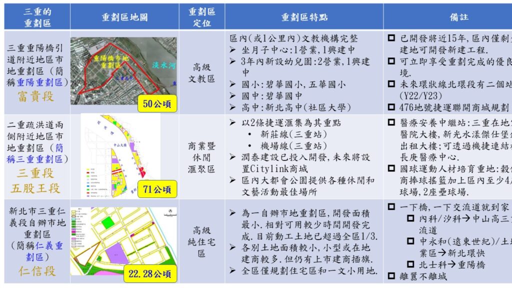 有能力一點就去三重重劃區,僅有一些經濟基礎的可以從仁義重劃區入門,介於中間的則可以先考慮重陽重劃區.
