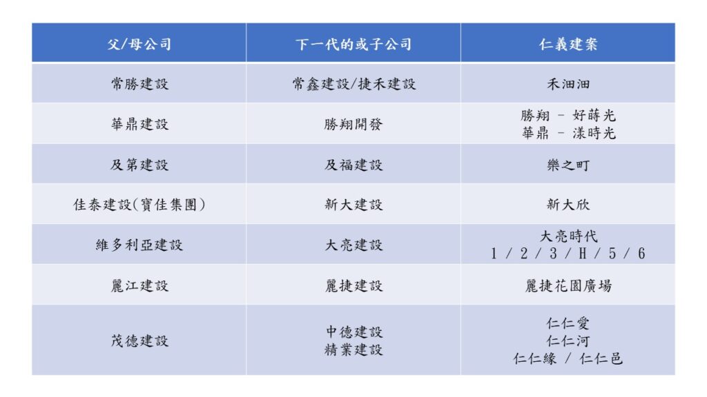 若真的要在仁義裡的建商做一份血緣表會讓大家更放心一點,仁義哥就幫大家做一份,僅供參考哦!
