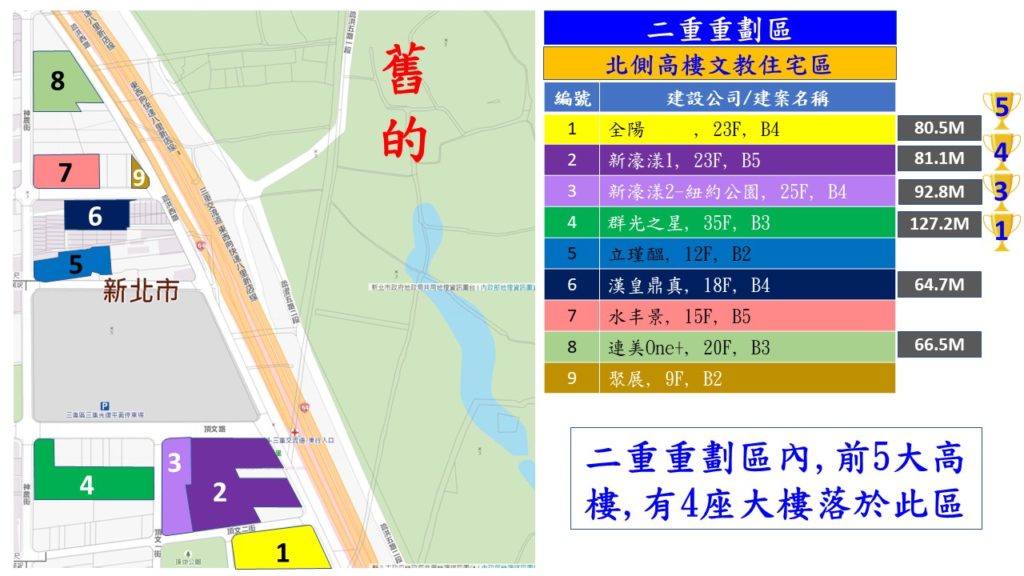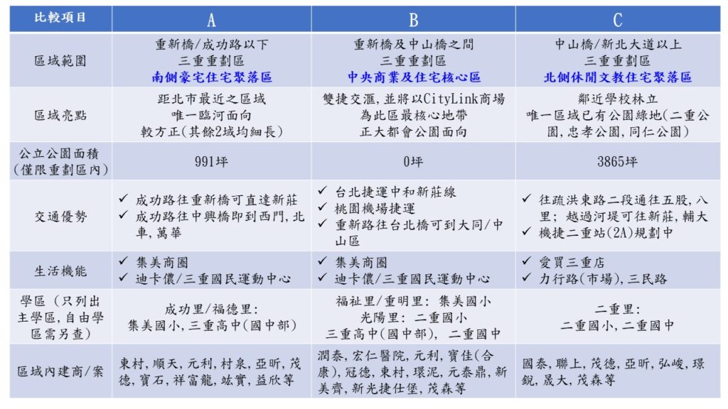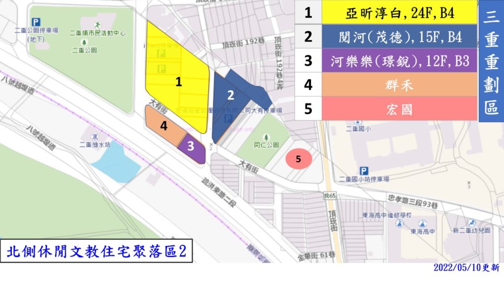在二重重劃區(五谷王段)這邊,仁義哥也幫忙大家,用不同的特點,將其切分為三塊,