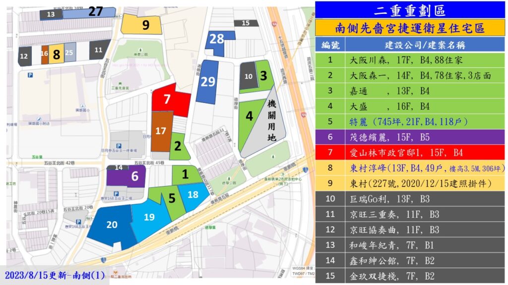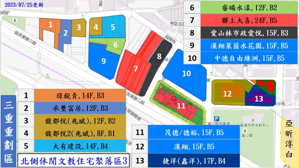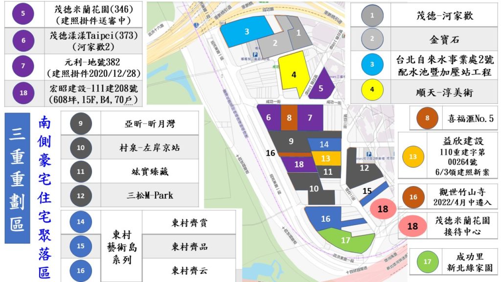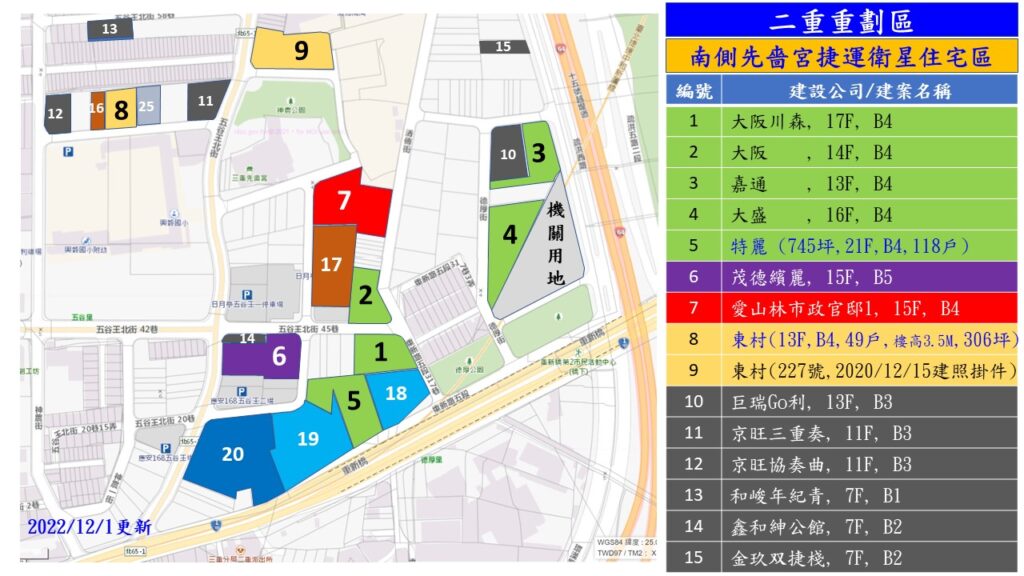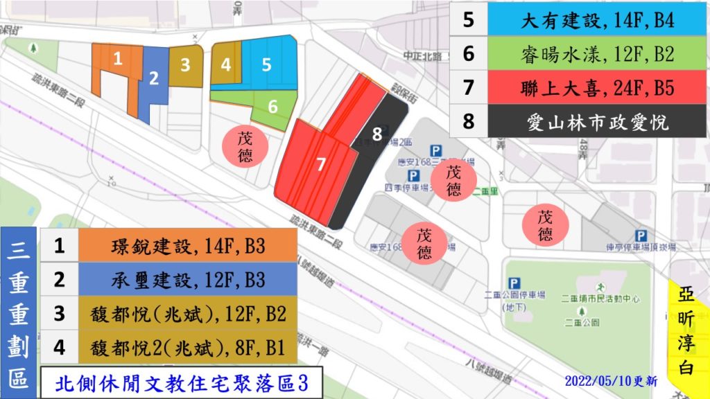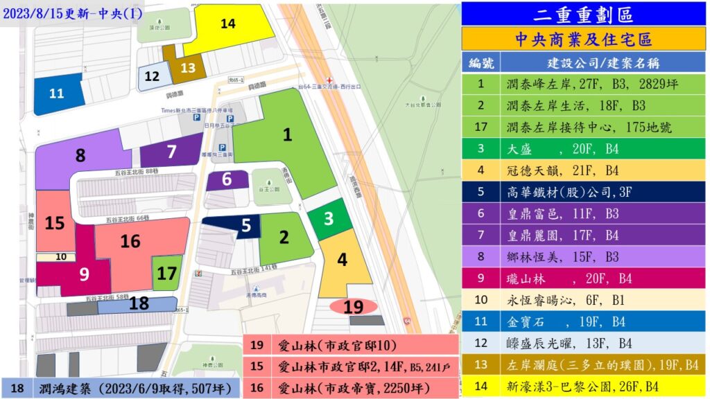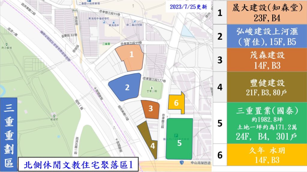 二重公園真的是很熱鬧的一個點,其周圍的所有建案之建照都已取得,而這附近的自由綠洲與萊茵水花園也正在銷售中,仁義哥也有對這二個建案有專文介紹.大家可以自行去查找. 所以在這裡只更新一下各建案的版圖.