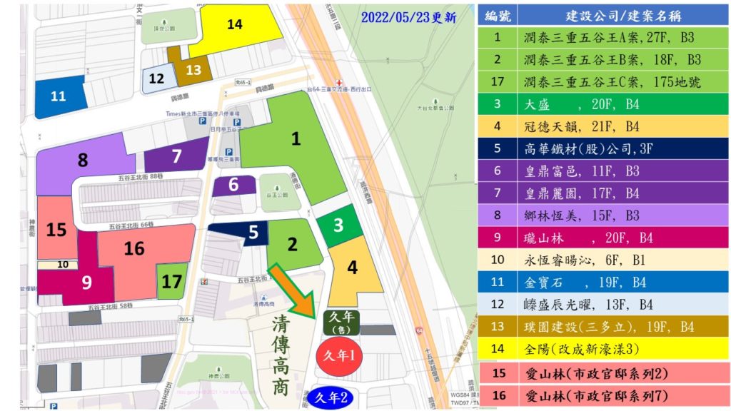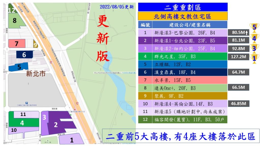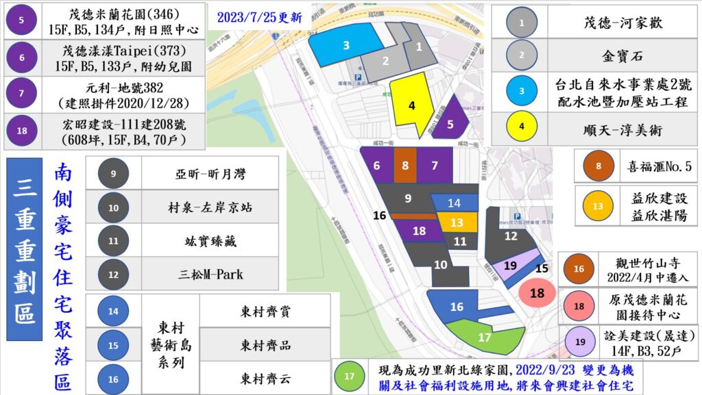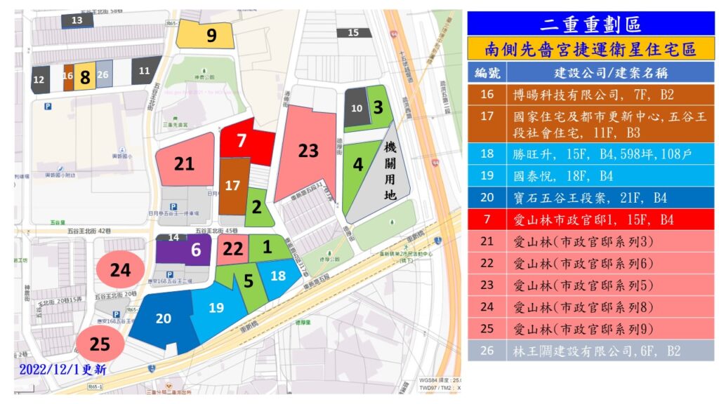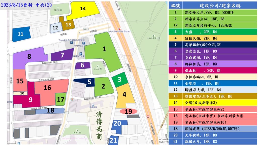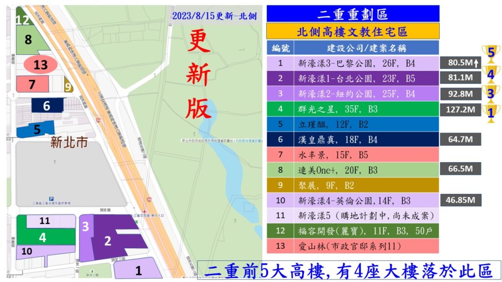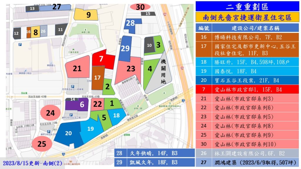 二重公園真的是很熱鬧的一個點,其周圍的所有建案之建照都已取得,而這附近的自由綠洲與萊茵水花園也正在銷售中,仁義哥也有對這二個建案有專文介紹.大家可以自行去查找. 所以在這裡只更新一下各建案的版圖.
