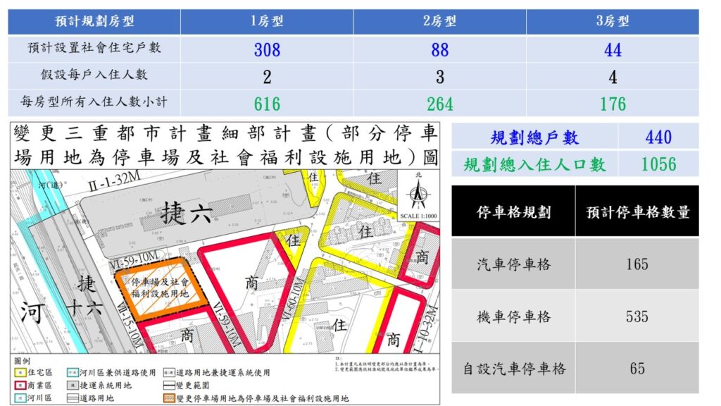 原本離三重捷運站最近的一塊停車場用地,為三重段248地號,2845平方公尺(約為860坪左右),目前正預計要公展把該地變成「停車場及社會福利設施用地」. 一旦變更完成,將來就能用來興建社會住宅,提供民眾最便捷的暫時租所. 另一方面,除了供給其本身的停車需求,亦能有增設汽車停車位的機會,對外提供停車位的供給.