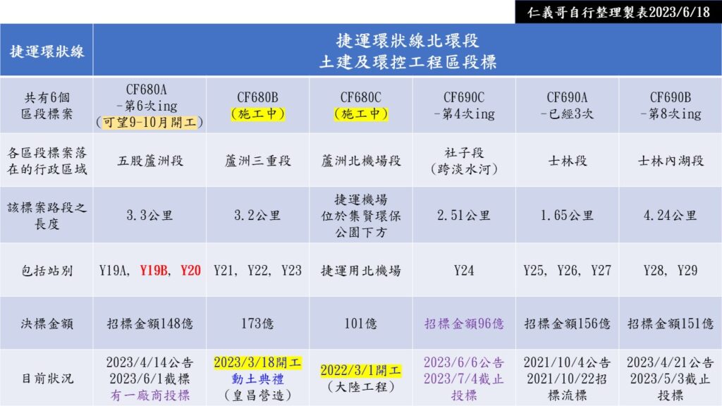 也把捷運環狀線北環段的工程發包進度放在這裡,方便大家查閱.