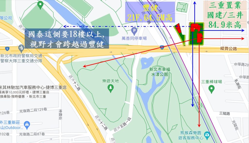 國泰建設與三井合資的三重置業在這區的建照也已核發,這個將近2000坪的大案,也是讓人相當期待. 當然,大家會注意到,在國泰旁邊的豐健21樓案,看似佔有大都會公園第一排的優勢,很有可能會擋到國泰建設這個案子的視野,但相信國泰的設計及其開窗面向,應該能儘可能找到最好的方向,仍有超好的視野.到時有資料後,再跟大家說明.