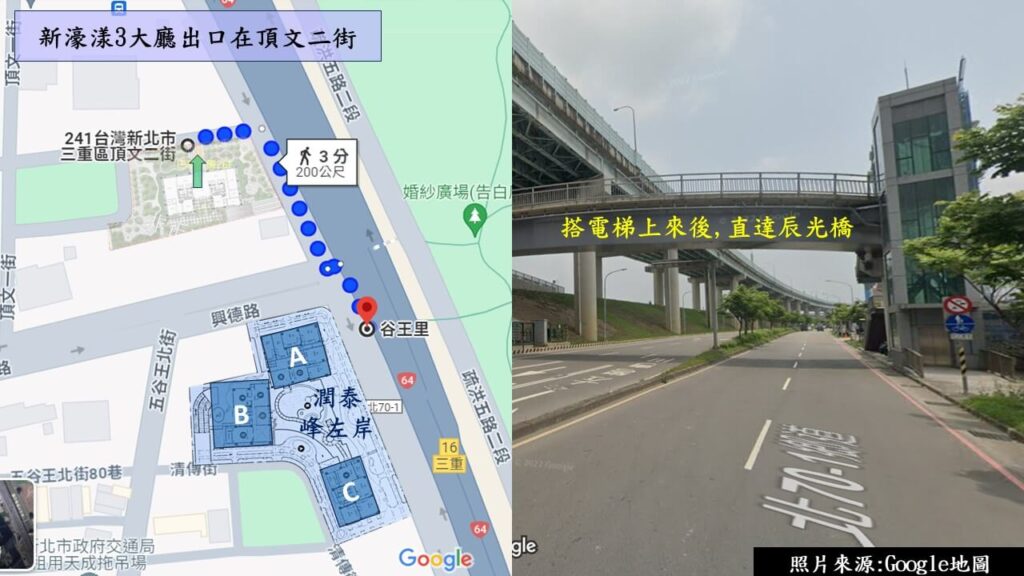 首先,由新濠漾3出發,過了興德路,直走到潤泰峰左岸A棟前方,有一個電梯(或樓梯)可以直達辰光橋,