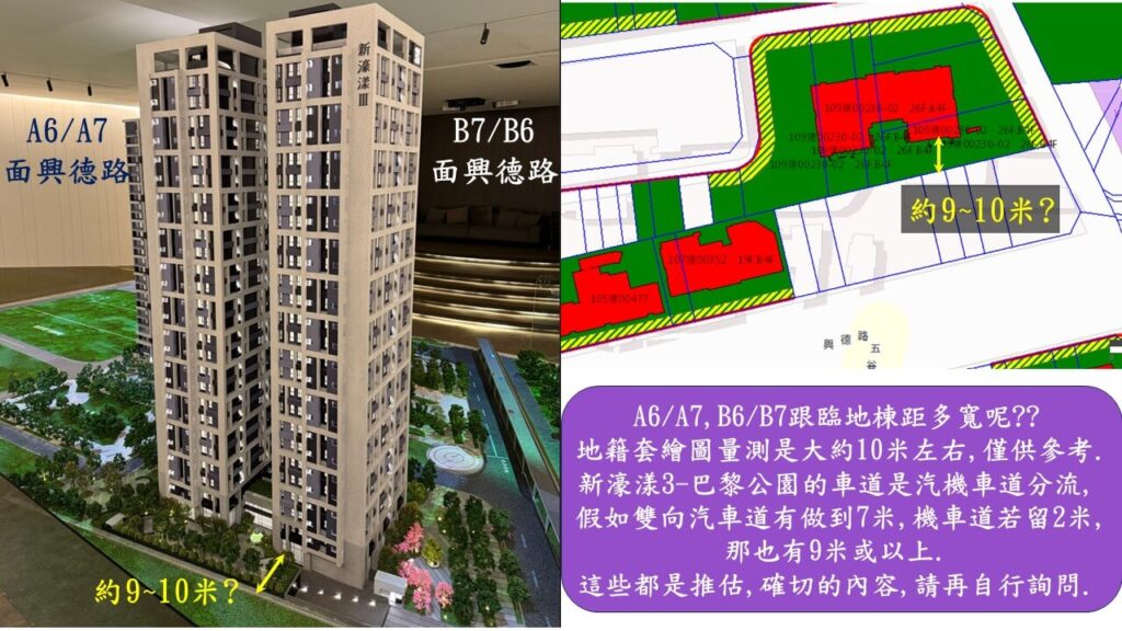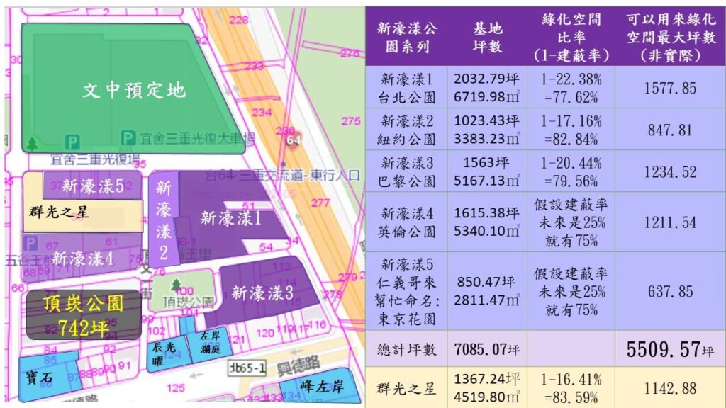 新濠建設在此區的建案,全都是以低建蔽率的方式來規劃(23%或以下),仁義哥在前面文章也有做一個簡單的計算,