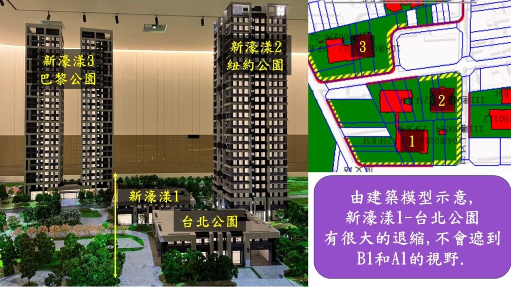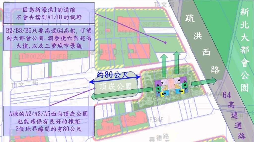 而且因為其位置的地利優勢,還有其周圍環境的因素(例如旁邊就有742坪左右的頂崁公園,新濠漾1-台北公園的超大退縮等),