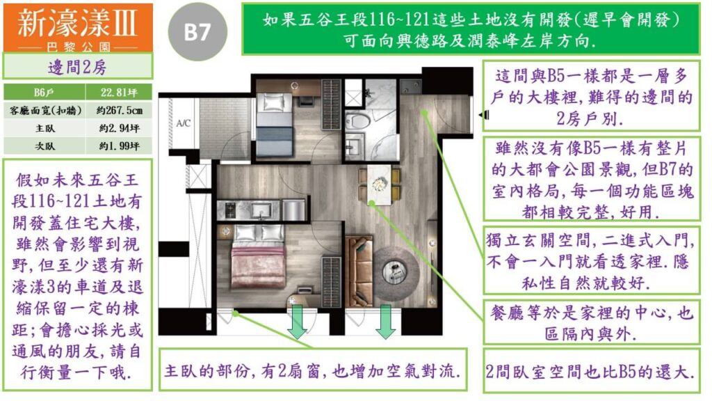 剩餘的7戶中,尚有3戶在A棟是面向頂崁公園,也算是公園第一排,但比較重要的是提供良好的棟距.
