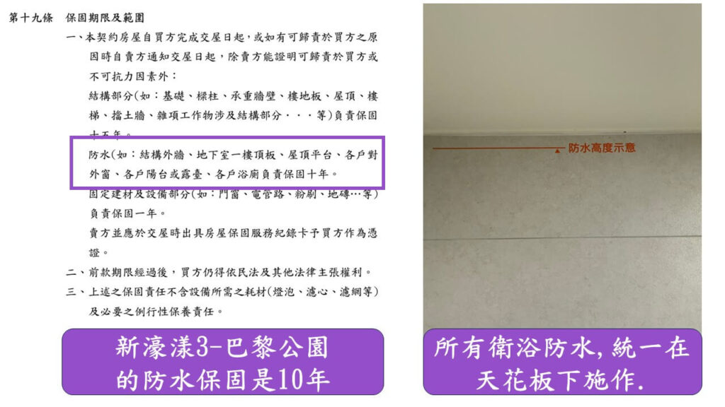 有關於保固的部份,新濠漾3的防水保固會是10年,而且在衛浴的防水高度也是統一在天花板下施作.