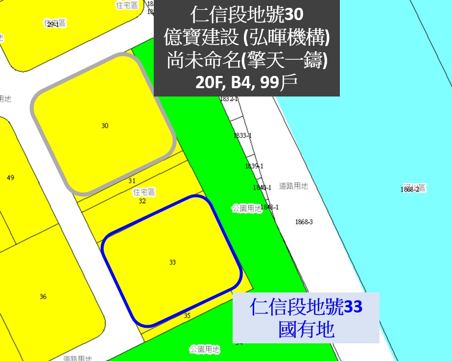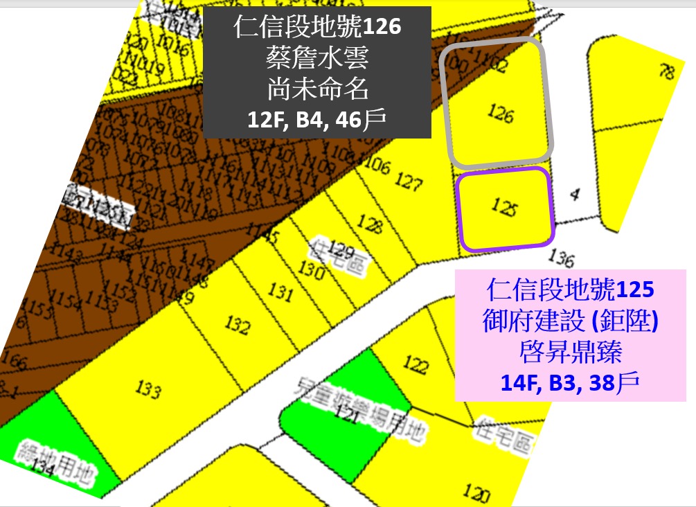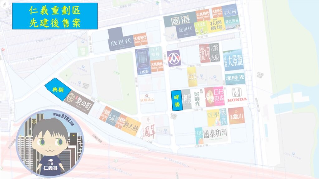 相信大家也都知道仁義重劃區還有2個基地在施工,一個是興樹的14樓案,一個是暉騰18樓案,所以也補上這2個先建後售的案子位置.