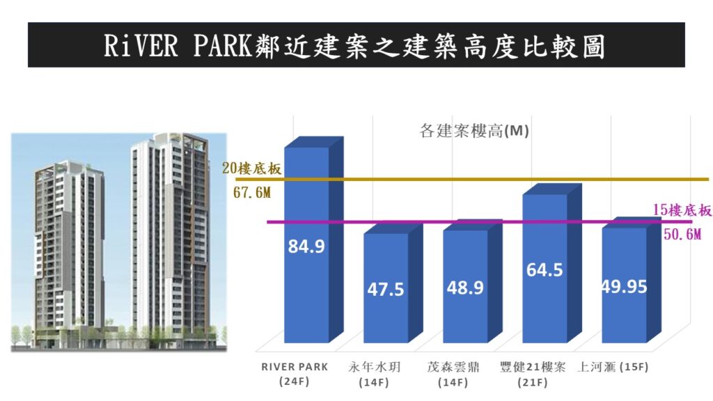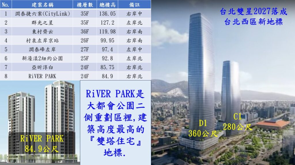 國泰RiVER PARK在該地區地標型的雙塔高樓住宅建築,才剛在2027年的第四季完工交屋;這跟台北西區門戶計劃最重要的地標台北雙星(C1/D1)大樓一樣,都在2027年時落成.