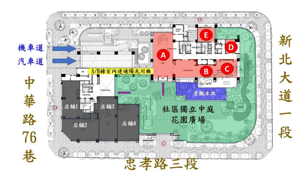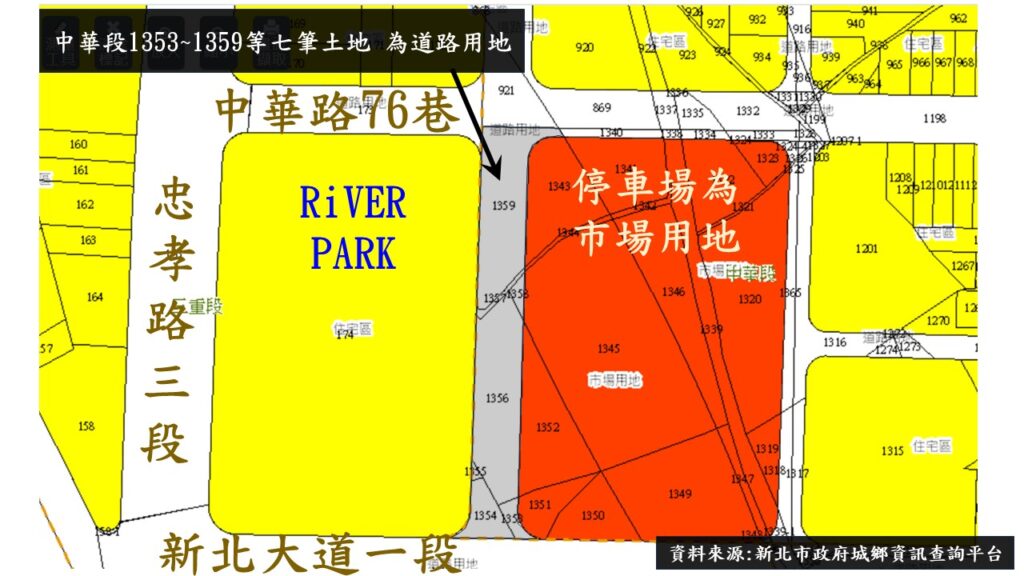 RiVER PARK的位置,是可以擁有四面臨路的條件,截至目前為止,其中三面是臨忠孝路三段,新北大道一段,中華路76巷;至於與隔壁停車場中間是否有機會再被隔出一個小巷道,或者人行道,雖然目前那幾筆土地是道路用地,但還得看未來隔壁這塊停車場的發展如何.