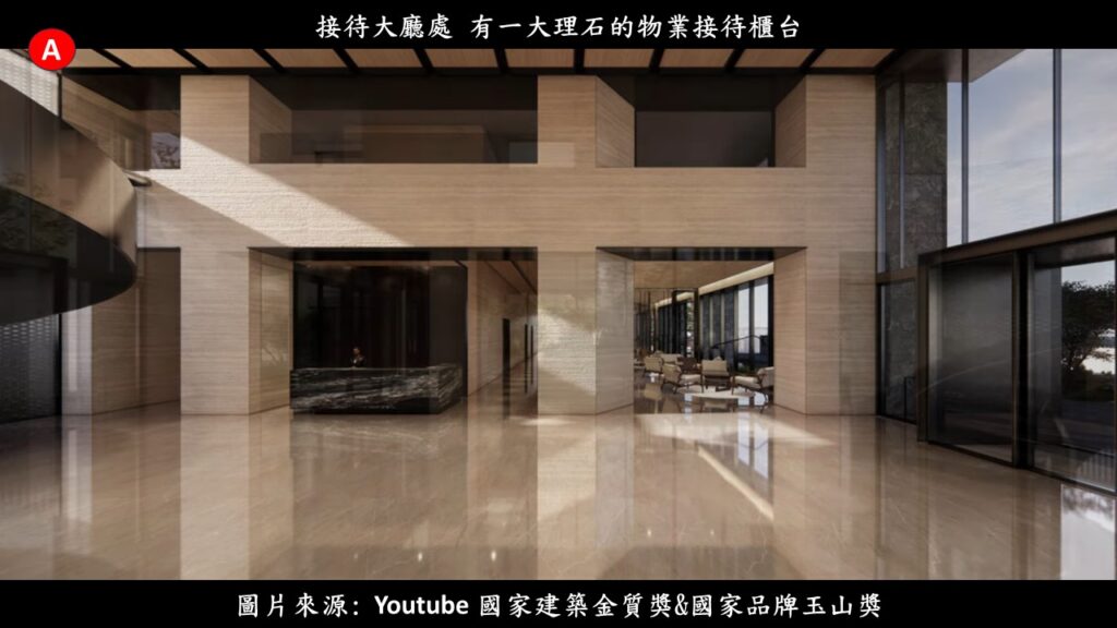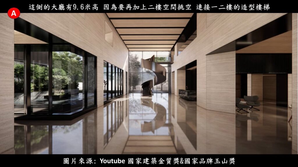 首先要先經過一個景觀水池,才會走到大廳門口.一進門,除了因為結合了一樓原本的樓高與二樓挑空形成一個9.6米樓高(1樓是6,2樓是3.6米) 的迎賓大廳之外,最醒目的莫過於站立在大廳底端的圓柱型樓梯.這個樓梯的設置還有另一個重要的用意,主要也是希望公共空間,是讓社區全體居民都可以使用的.不過若到了私人空間,就也要有些區隔;這樣的話,A棟的居民就不會去搭到B棟的電梯,只會透過這個樓梯或者一二樓專用的升降電梯來在公設區移動.