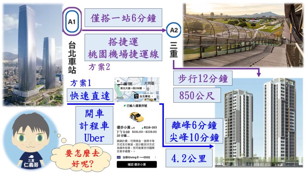 不過朋友到是補充了一件事,如果要去機場,他們不會到A2三重站;反而是直接搭計程車或叫車到A3站(新北產業原區站),只需開車8到10分鐘.然後在A3站轉乘機捷的直達車,大約只要27分鐘,就到機場了(第一航站).