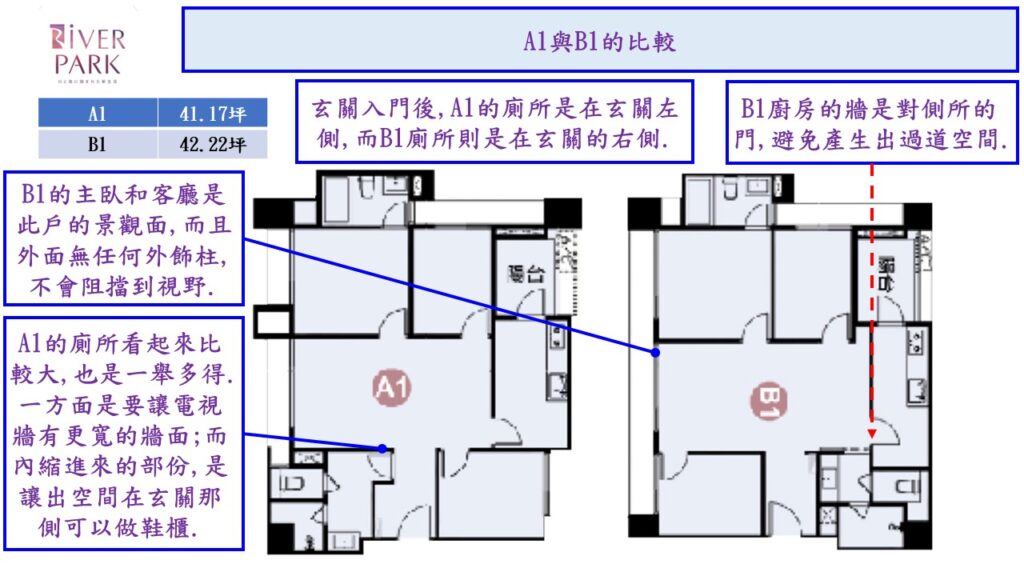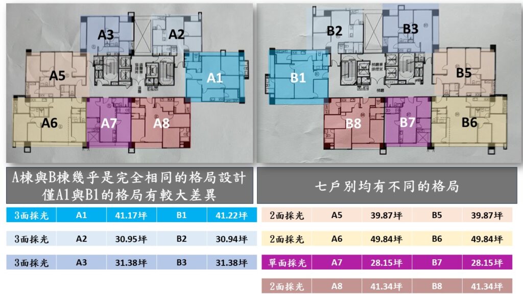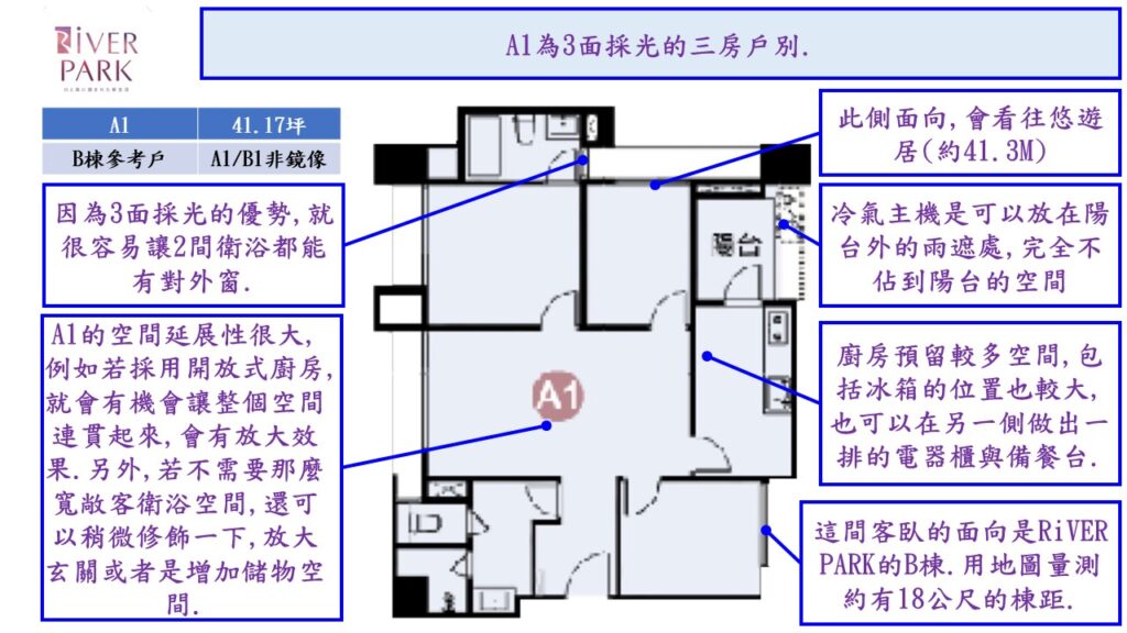 一樣也是41坪左右的A1及B1戶,最特別的原因是它們有三面採光的優勢.