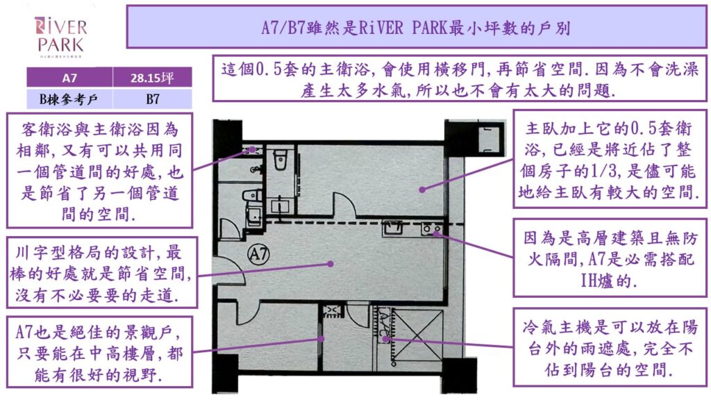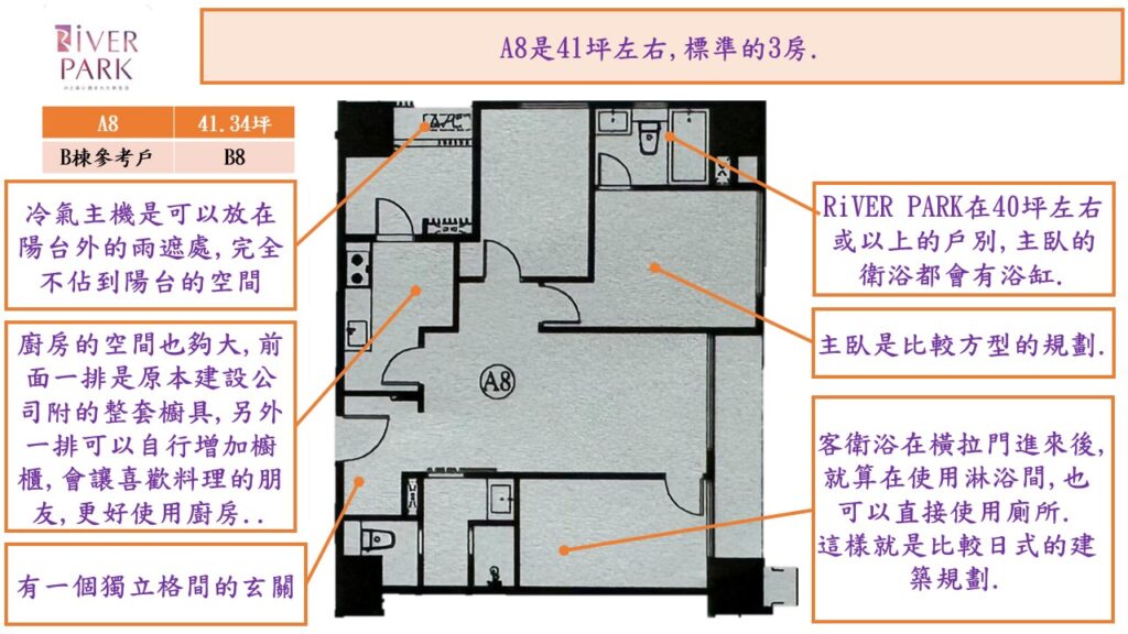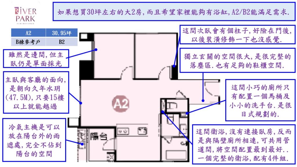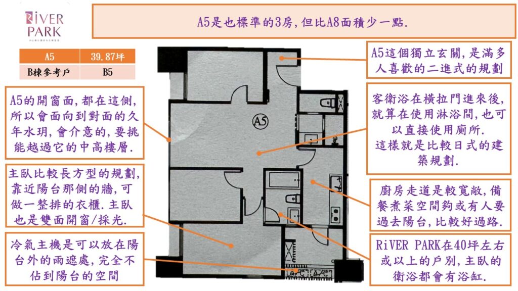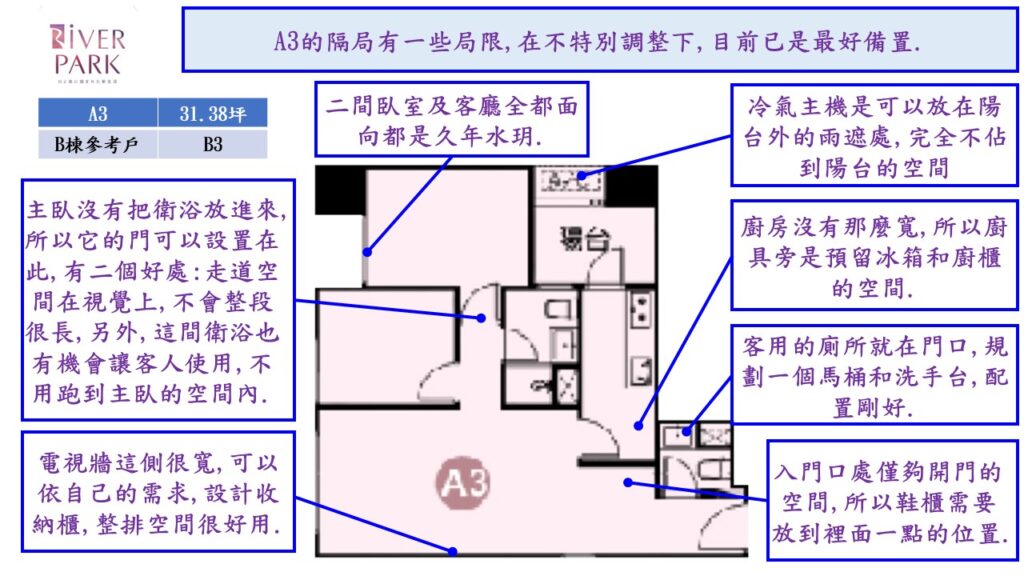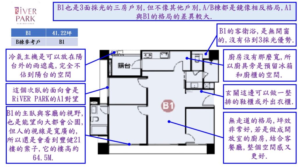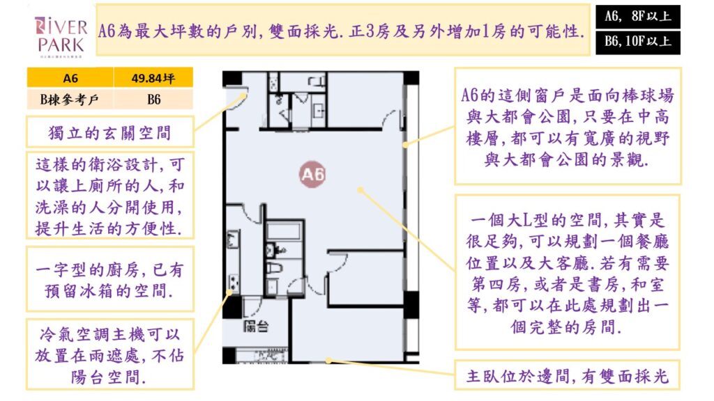 雖然不是真正的大都會公園首排的位置,但因為其周圍的固定式建築,像是中山高架橋,機場捷運,棒球場,鄰近的新住宅大樓丟高度都已確定,不會真的全都擋到RiVER PARK.所以,在B棟的B6/B7/B8以及A棟的A6/A7/A8只要樓層不要太低,都還是有相當的景觀條件.