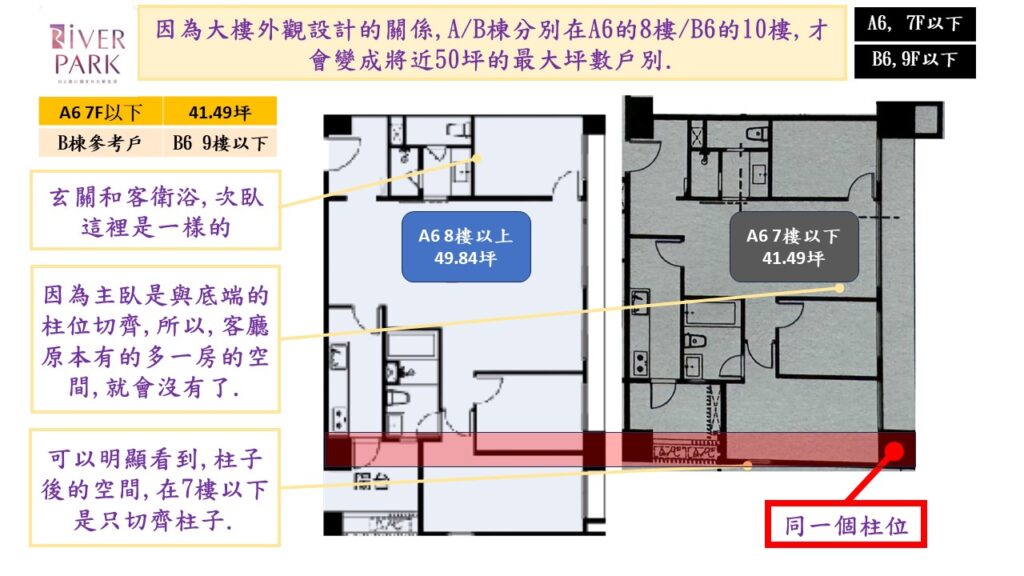 朋友還說在A棟的A6戶別,必需要是8樓以上,才是將近50坪最大坪數的規劃,若低於7樓(含7樓),則會變成41.49坪. B棟也有類似的規劃,但它需要10樓以上才是50坪左右的戶別,低於9樓(含9樓)也是41.49坪.