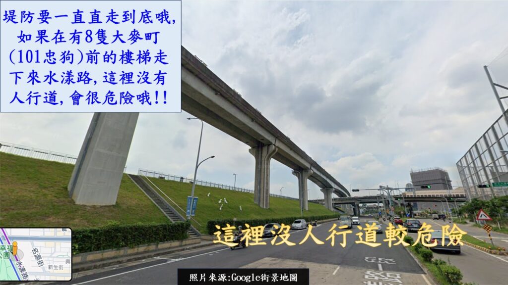 若以仁義哥針對三重重劃區,大都會公園右岸這側的區塊分類,RiVER PARK所屬位置是重劃區北側休閒文教住宅聚落中,但因為已在邊緣處,所以其實是整個北側新的住宅社區中,靠近中央商業核心區最近的一個案子.可想而知,距離A2站(三重站)也沒多遠,用估狗地圖來看,就只大約850公尺. 因為時間還早,所以出站後,就直接走在大都會公園旁邊的堤防上,慢慢散步過去.