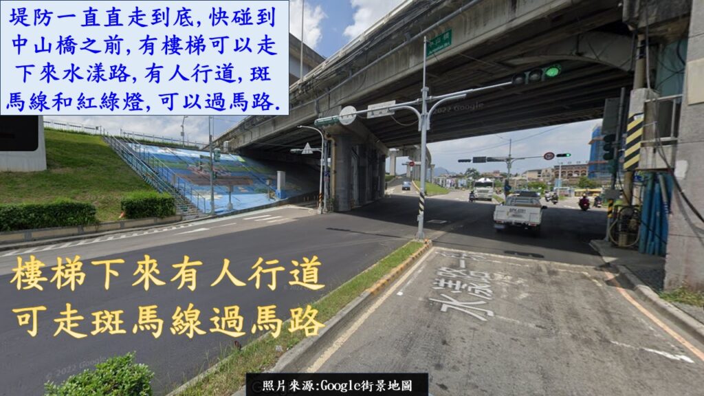 一邊看著公園裡的各種有趣的景象,一邊散步在堤防上,一直走到底,在快到中山橋那邊,會有一個往水漾路的樓梯,走到水漾路再彎進中孝路三段,不一會功夫,就到了RiVER PARK.看一看手錶,大約步行大約12分鐘左右,就能到RiVER PARK.
