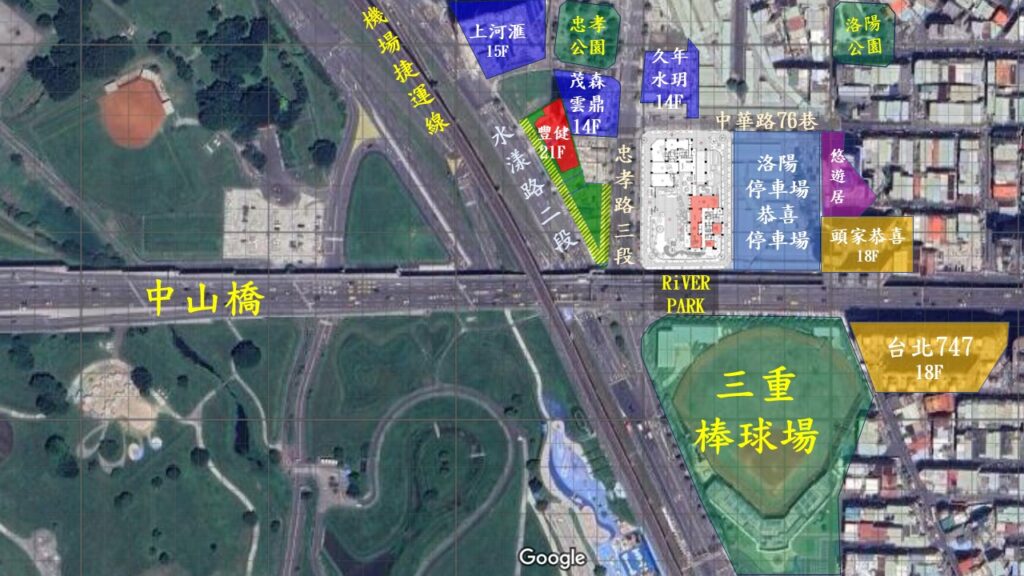 旁邊也有一些新的社區與RiVER PARK一樣被劃分在市地重劃,包括忠孝路三段對面有茂森雲鼎與豐健的21樓案,而中華路76巷對面有久年水玥.而當初在2024年4月正在預售RiVER PARK時,在停車場旁(市場用地那塊)也有一個新社區悠遊居正申請使照.