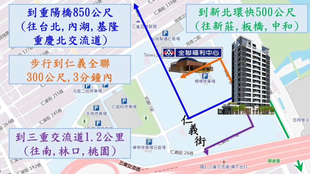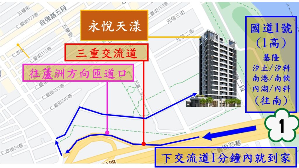 一到三分鐘內就到家的無敵便利性.因為一高(國道一號)的三重交流道(往蘆洲的匝道口)下來就是仁義重劃區,