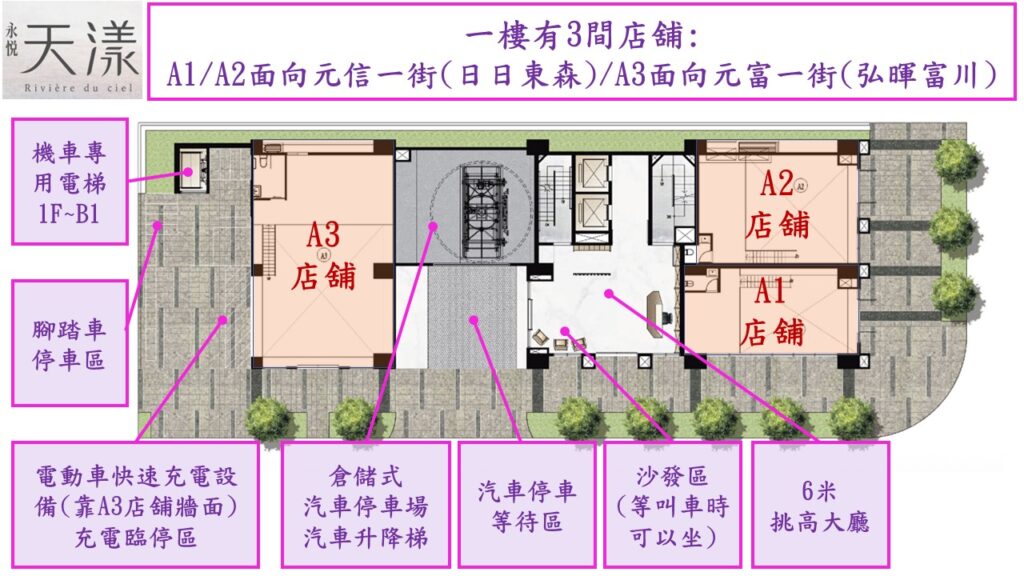 一樓為三間店舖與大廳.室外區有一處為倉儲式汽車停車場等待區,而機車下樓專用電梯與腳踏車停車區均在左邊.