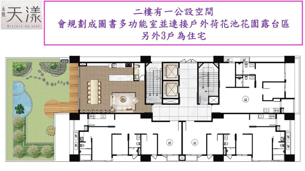二樓規劃一公設,將來會是圖書及多功能室,並配置一戶外露台,會打造一個漂亮的荷花水池花園露台.