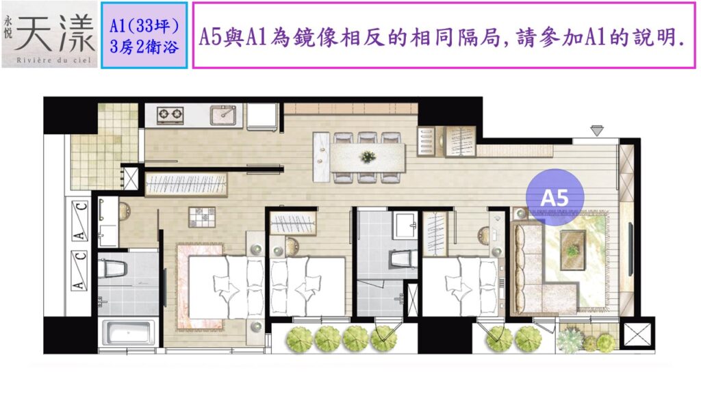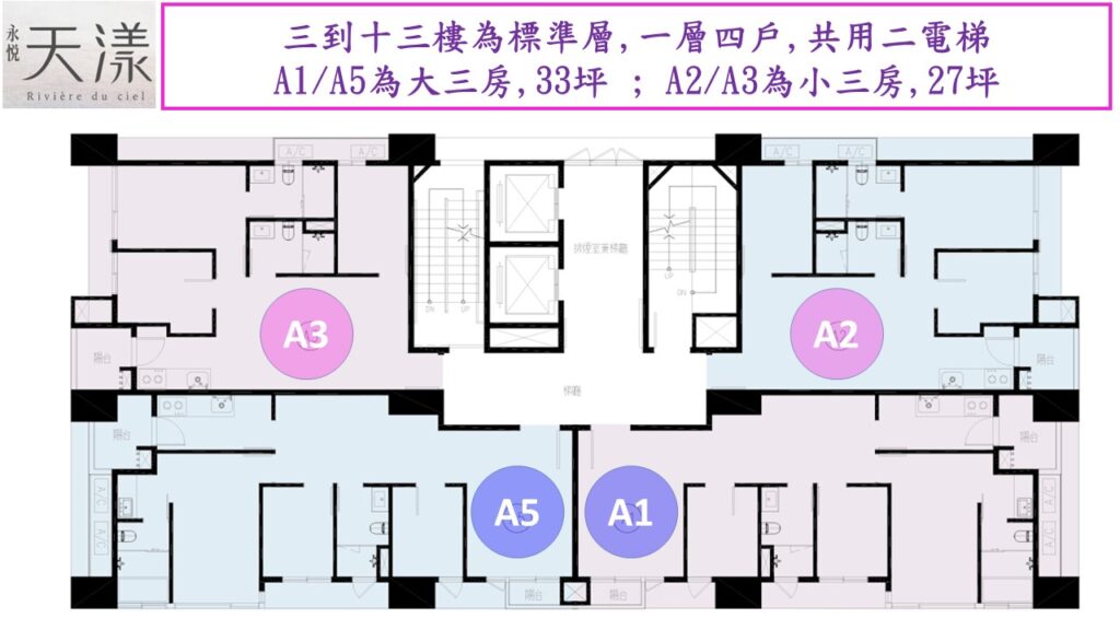三樓以上就是標準樓層,一層四戶.但因為A1與A5及A2與A3都是鏡像相反的相同格局,所以仁義哥僅挑A1及A2來做介紹.