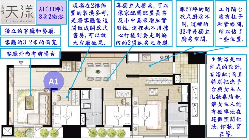 面向仁仁邑的那二戶(A2和A3為27坪房型)主衛浴與其中一間次臥是開窗面向仁仁邑.