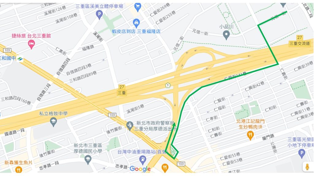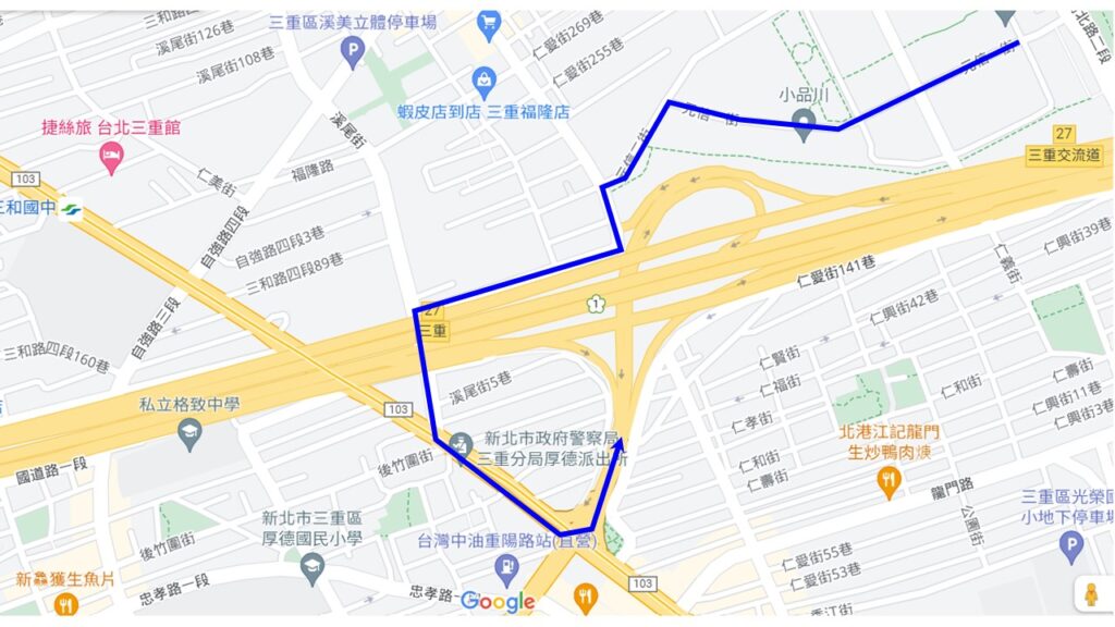 藍色路線示意為:元信一街元信二街–>仁愛街–>溪尾街27巷–>溪尾街–>三和路三段–>三重交流道