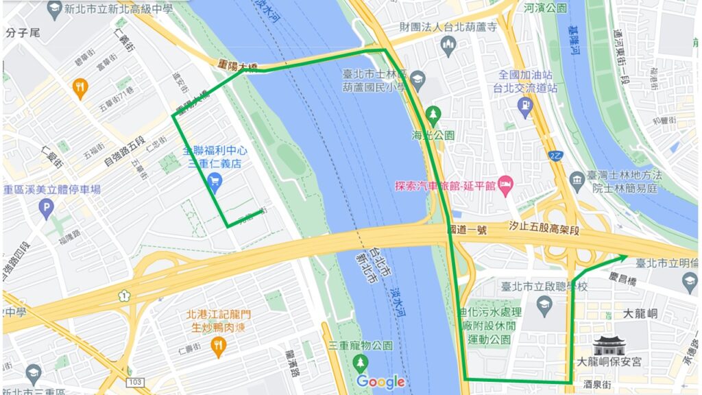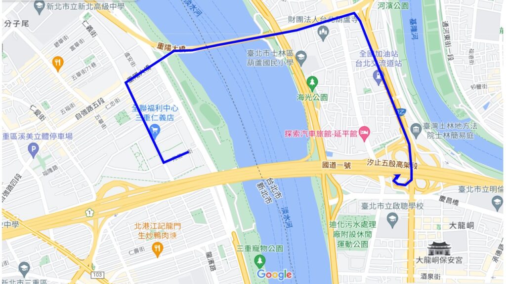 藍色路線示意為:仁義街–>自強路5段–>重陽橋–>重陽橋引道(往中正路)–>中正路–>重慶北路4段–>重慶北交流道