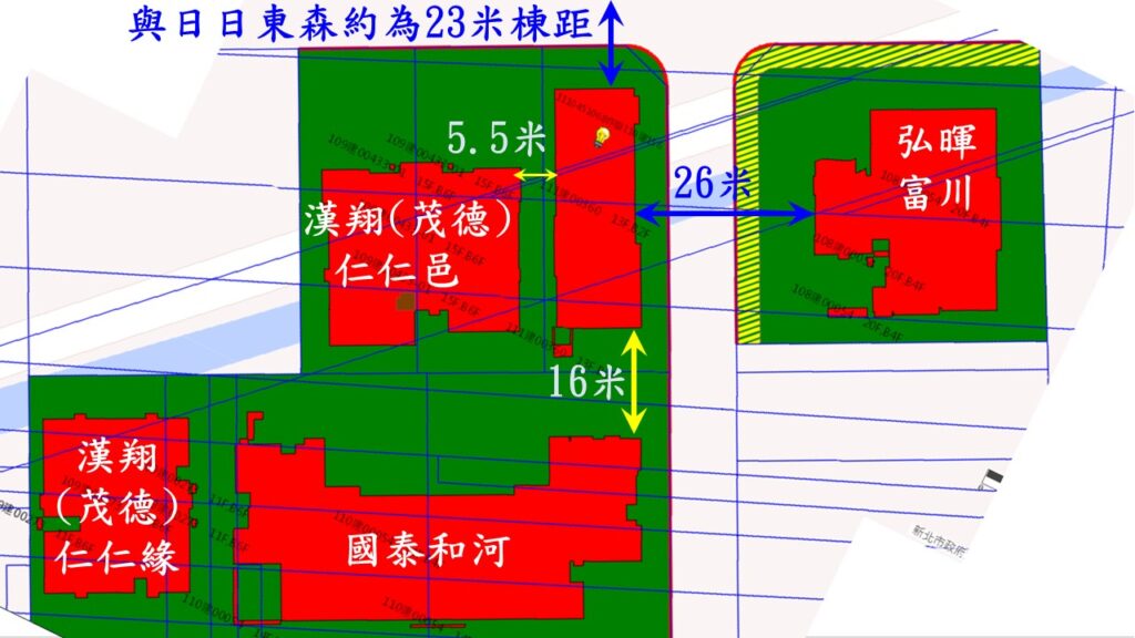與上方的日日東森(成屋),因為隔著元信一街,再加上退縮,約有23米的棟距.