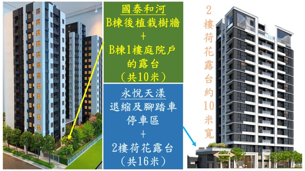 實際上,永悅天漾的二樓有一個露台空間,所以得扣除露台後,才是3樓以上的建築線.因此,這裡的棟距也可以達到26米左右.