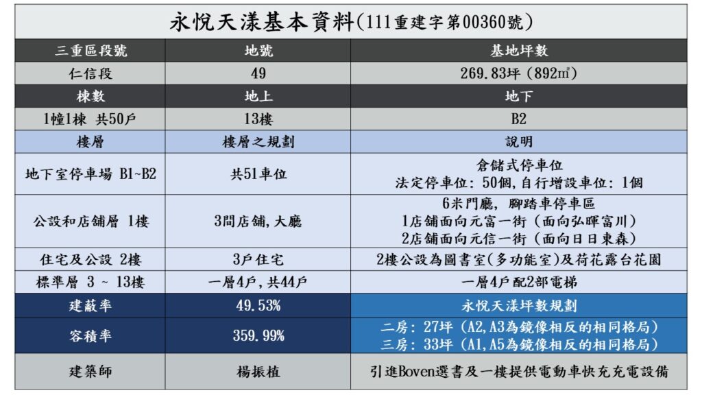 永悅是在目前仁義重劃區裡已送建照,標準樓層樓高達3.6米的三個建案其中之一(另外二個是大亮時代6和三鼎建設),