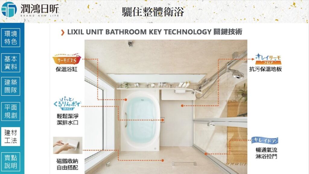 而在整體衛浴解決方案裡,潤鴻找的是超過50年以上的驪住集團.比較特別被信義代銷圈選出來特點,放在工學館的大概有5項,包括: