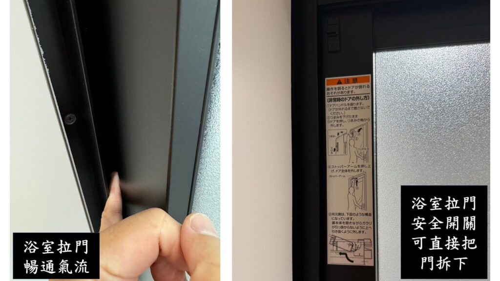 (3)淋浴拉門,有通風的設計;而且還考慮了若人昏倒在裡面,有安全開關,可以直接把門拆掉.