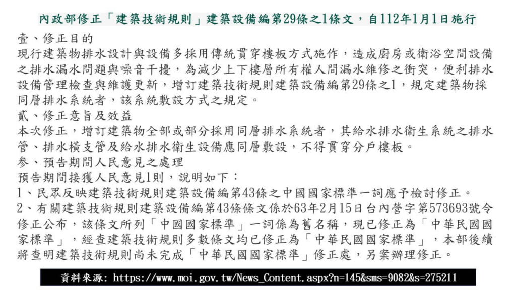 增訂公寓大廈得採同層排水系統,其排水管、橫支管及衛生設備在同層設置,不貫穿分戶樓板.