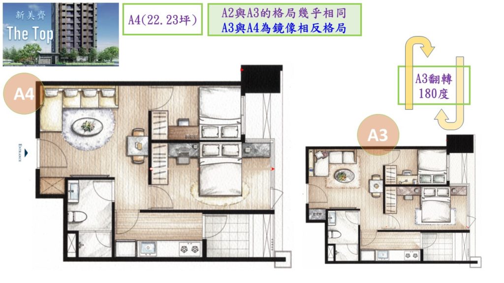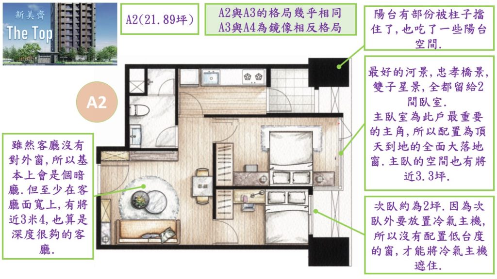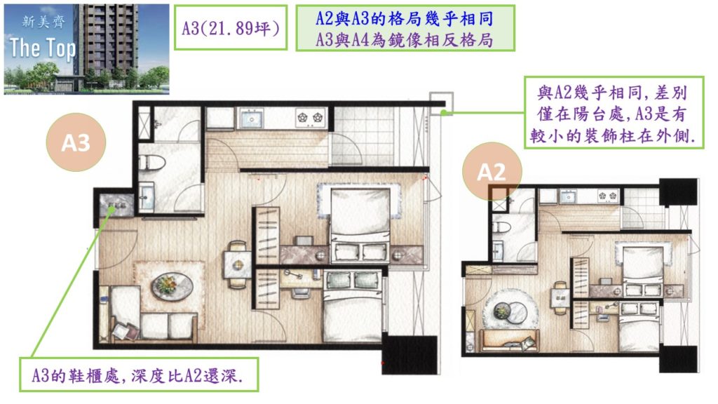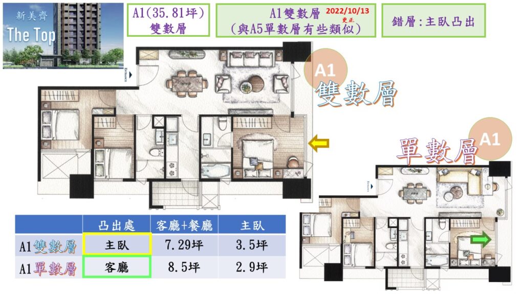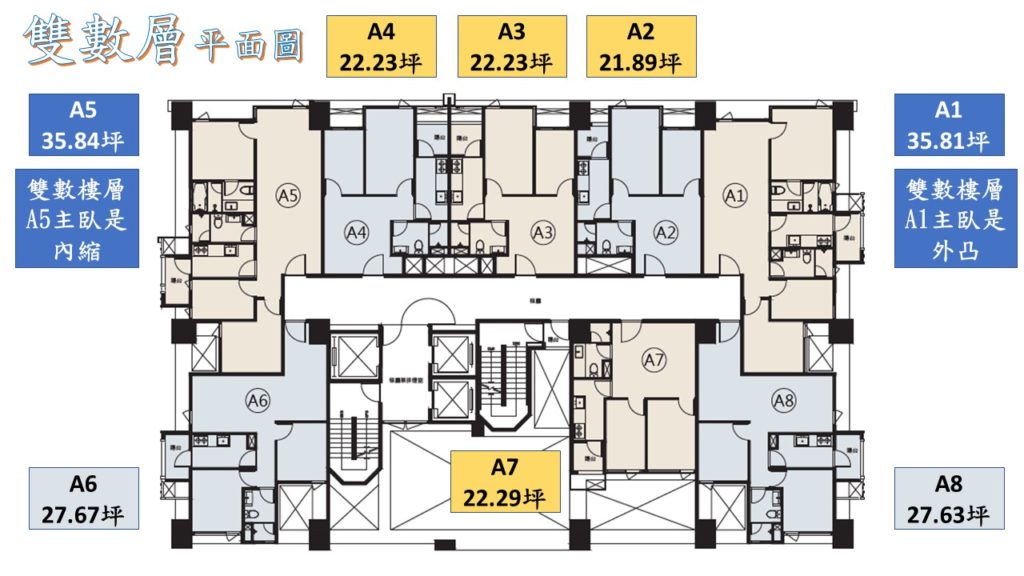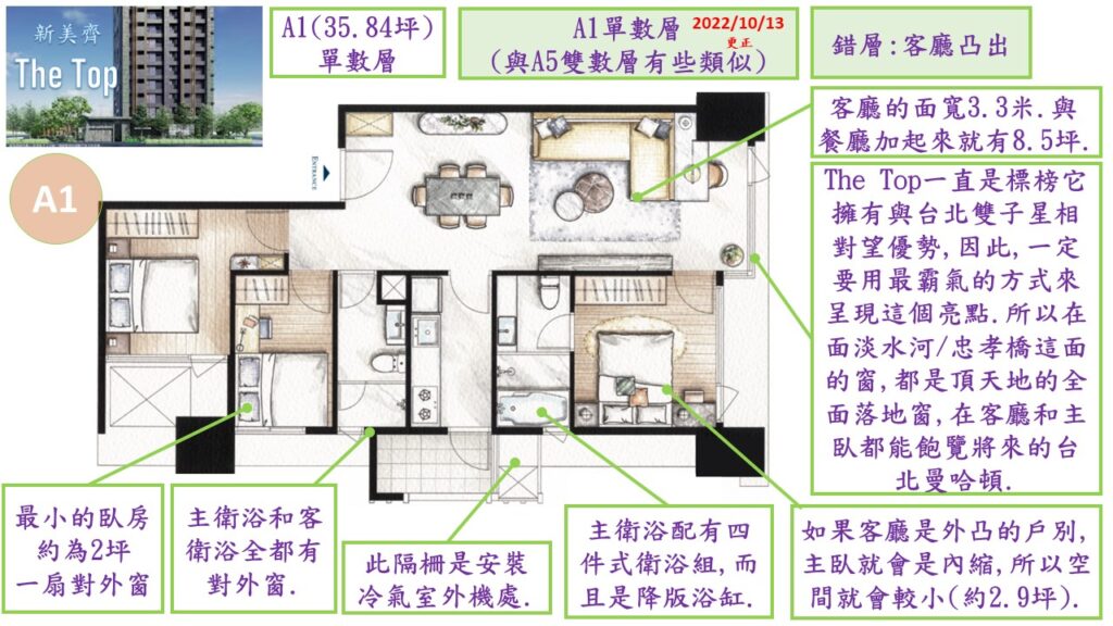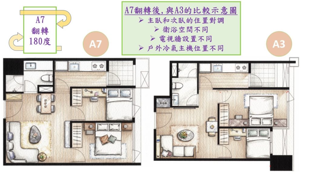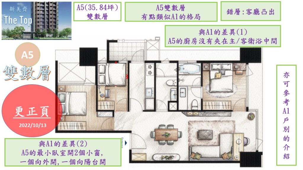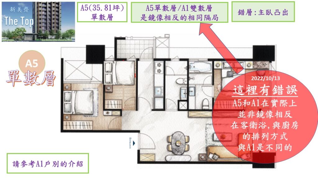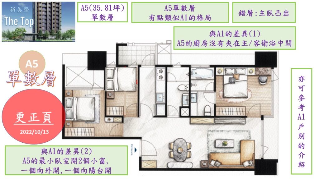 [2022/10/13] 謝謝粉絲朋友特別私訊仁義哥來提醒原本PO文中,有錯誤訊息,把A1和A5看成鏡像相反的相似隔局. 但實際上,在主客衛浴與廚房的排列方式及最小臥室開窗上是有明顯差異的. 已經將圖文都做更正,再次謝謝.