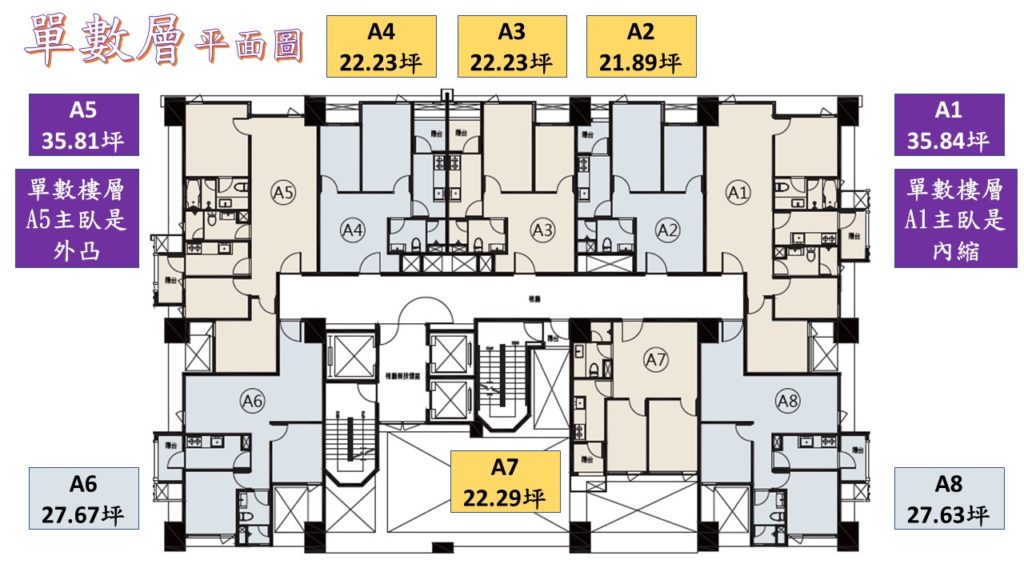 同樣面向,本案最大坪數(約35坪)位於邊間的A1和A5也都僅剩低樓層可以選擇.
