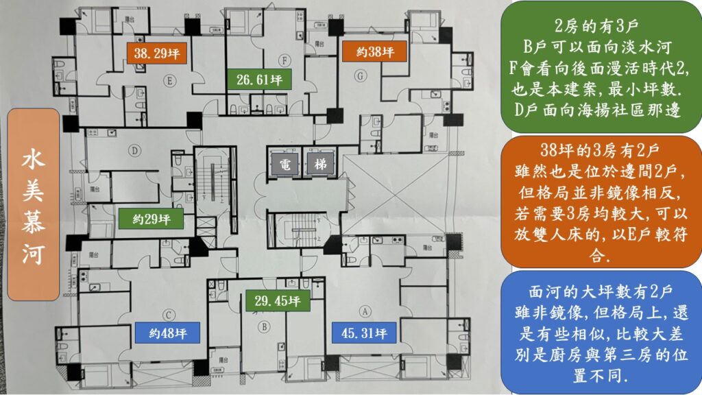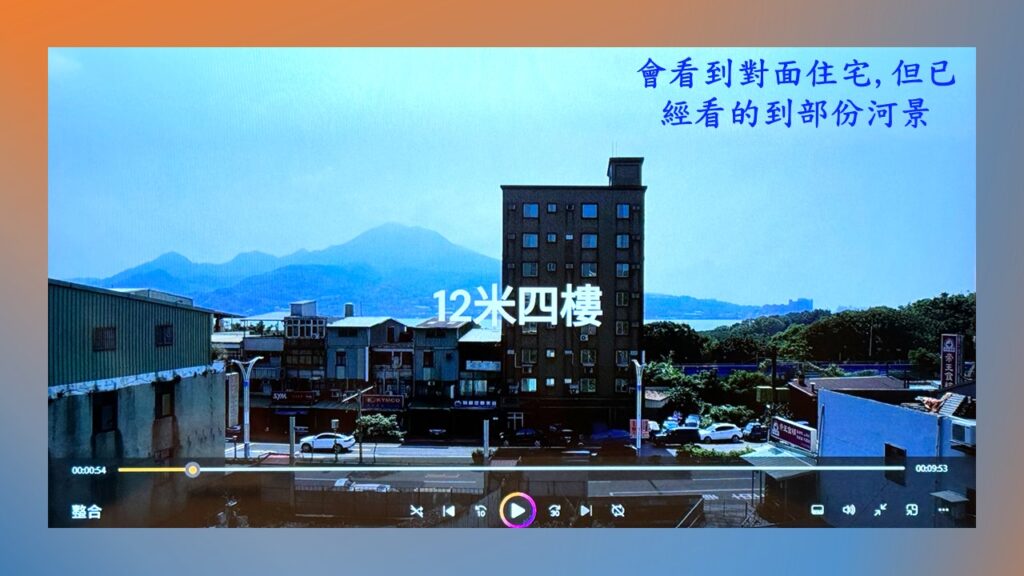 能在淡水河的河岸第一排,就能天天欣賞這片山河景觀;水美慕河亦有這樣的優勢.不過因為在其正對面,有一棟8層樓的建築,所以,若會介意被其遮擋住部份的景觀視野,則可以選擇較高樓層.