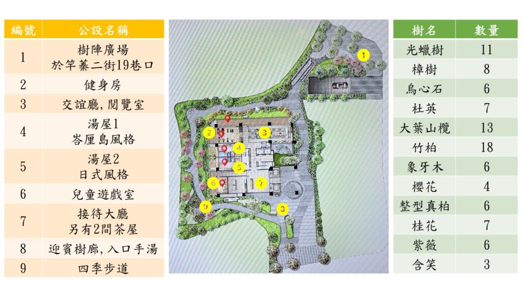 例如整個溫泉會所設置在的C棟,就被稱為樹之『泉』,而位於更上方,得把上面的山坡挖平才能蓋在這塊土地上的D/E/F/G,就稱為樹之『岩』,而最靠近一旁原生樹林的B棟,就被稱為樹之『森』,最後就是剛好蓋在凸出一塊土地的A棟,就被稱為樹之『丘』.