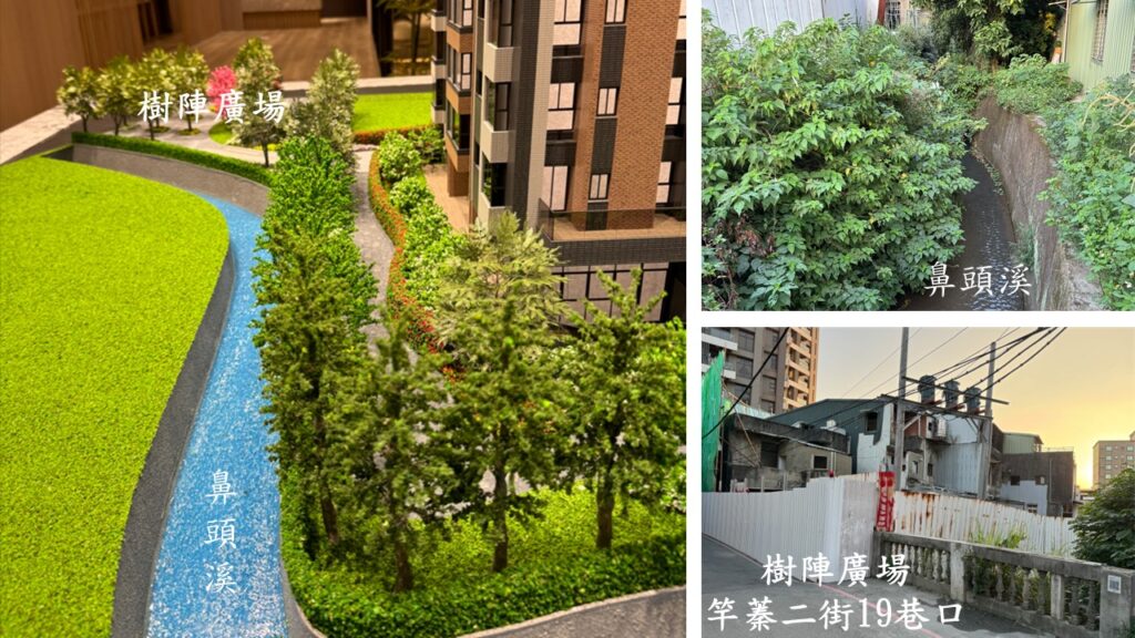 在竿蓁二街19巷口,也有一處社區的樹陣廣場,向內走20米左右,也可以到水美慕河的建物裡.