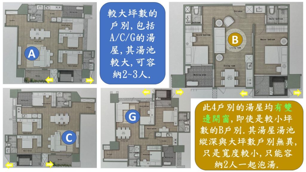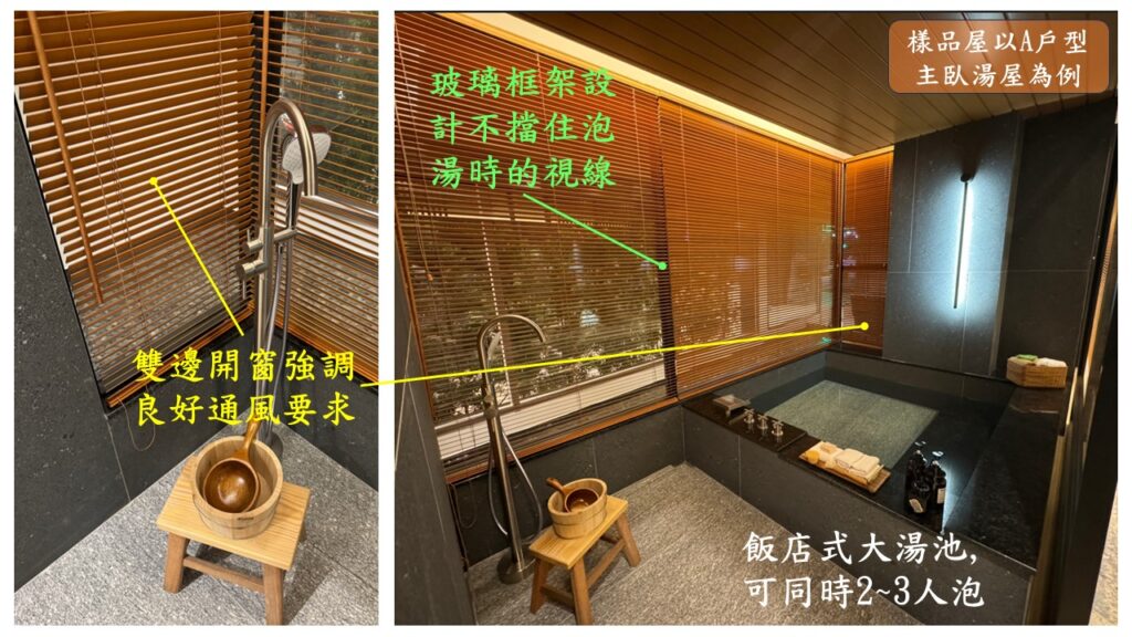 而且,泡湯時在室內要能空氣流通非常重要,這樣才能泡的較久,也能泡的舒服.而水美慕河的主臥湯屋幾乎在所有較大坪數的房型(包括A/C/G)都有雙邊開窗的設計;甚至是面河景較小坪數的B戶型,也都有這樣的設計.