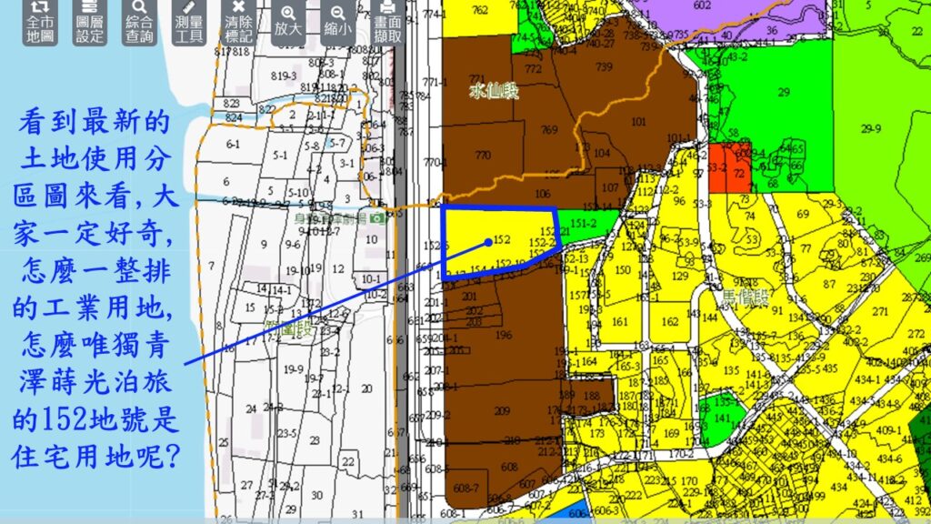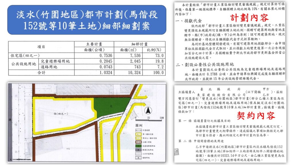 大約在民國94年(2005年)的8月24日時,新北市政府即公展了淡水(竹圍地區)都市計劃(馬偕段152號等10筆土地)細部細劃案.東家透過政府在推動都市計劃工業區檢討變更審議規範,將具有休閒,觀光,住宅等的土地,透過都市計劃來變更使用分區.因此就把馬偕段152號土地改成住(四之一).不過也因此計劃,而將151-2捐出,目前已經是開放公用的公園. 這也讓將來青澤-蒔光泊旅完工後,該住戶下樓就有公園的另一項好處.