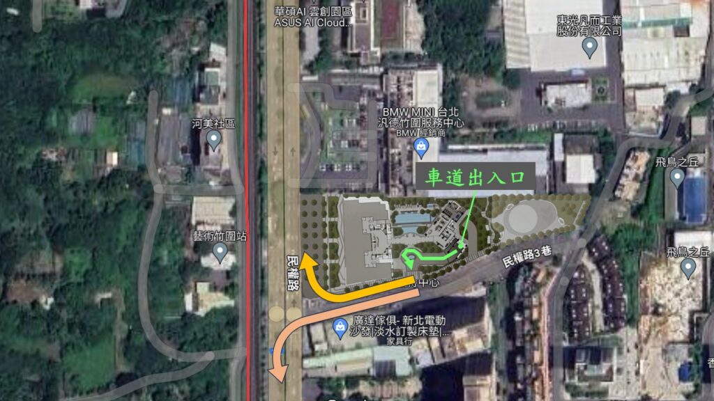 青澤的車道的入口是從民權路3巷進出,這樣也較方便到民權路後,可以直接右轉往紅樹林,淡水老街,或將來淡江大橋方向.而等紅綠燈後左轉,關渡大橋去五股/八里或過大肚路後就到北士科.