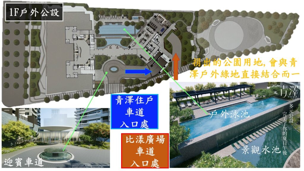 而青澤也不是像其他建案,需要往山坡上走,就直接在平地的最主要道路上,能擁有2277坪,所以就能規劃更充足的公設給住戶使用.