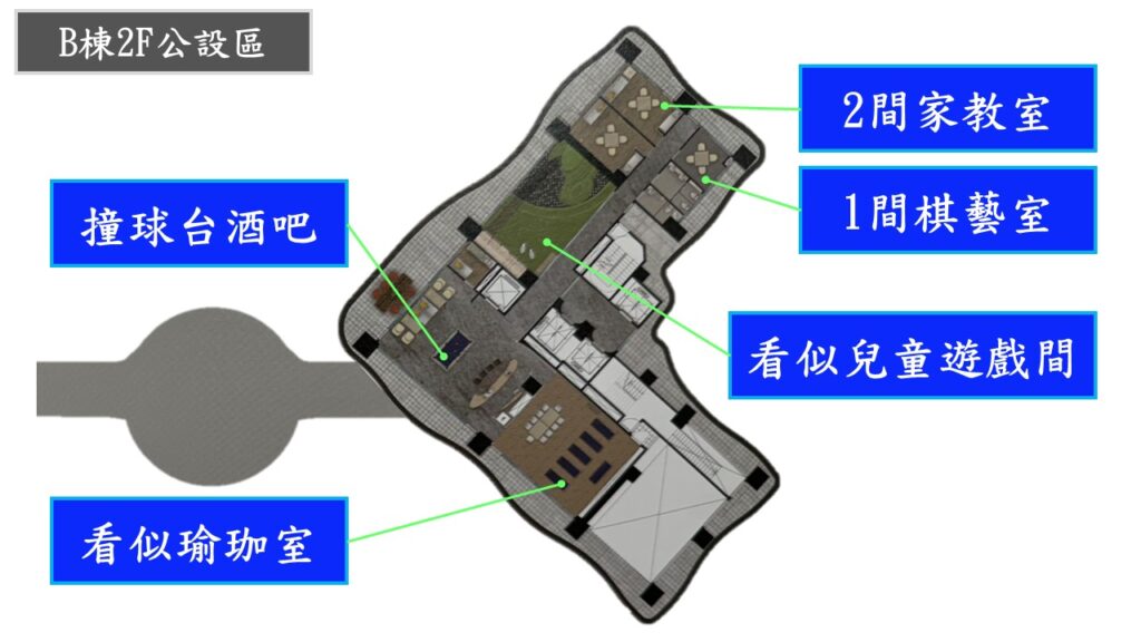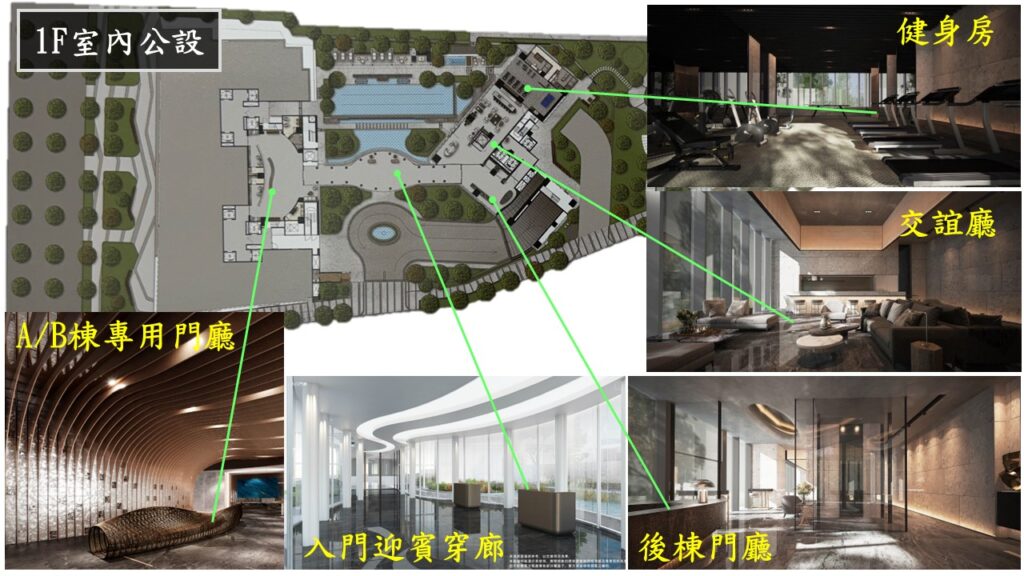 主要的公設是在前棟的二樓及後棟的一/二樓,以及一樓戶外的泳池區.但在前棟頂樓雖也有設置泳池,但僅供購買A/B棟大坪數的住戶使用.