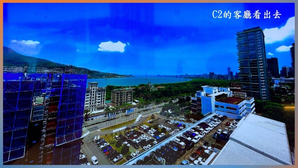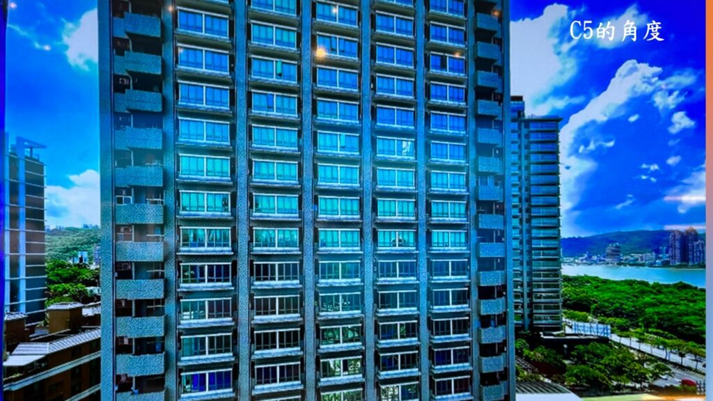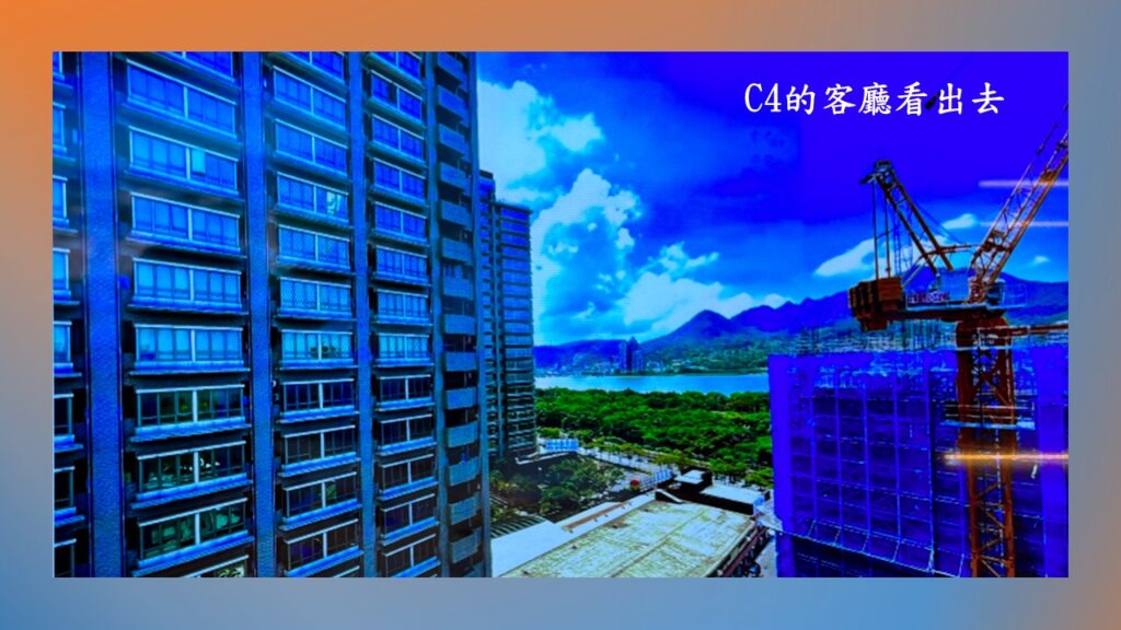 A/B棟因為是大坪數,本身就比較大棟;而且後棟就完完整整地站在它後面,原則上,應該是幾乎遮住了後棟的景觀. 但因為後棟採用倒V字型的設計,所以C1/C2/C3都還是能以側邊看到部份的淡水河.不過C4和C5可能會被隔壁的工業住宅大樓給遮住.