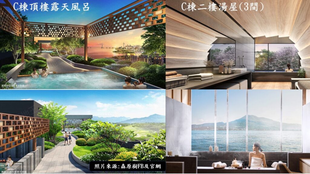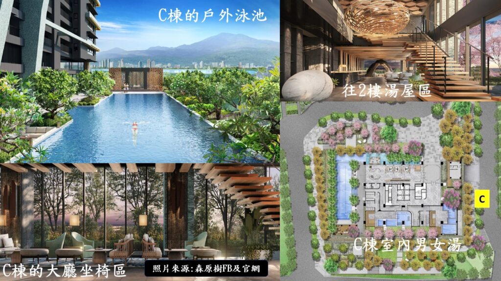 跟水和溫泉有關的,全都設置在C棟的森之泉裡.包括一樓有戶外泳池,景觀水池.室內則是男女分開的三溫暖溫泉,且附有SPA. 二樓還有提供住戶個人或家人使用的湯屋. 頂樓為露天的溫泉區,也是採男女分開的規劃.因為夠高,可以一邊泡湯,一邊欣賞淡水的風景.
