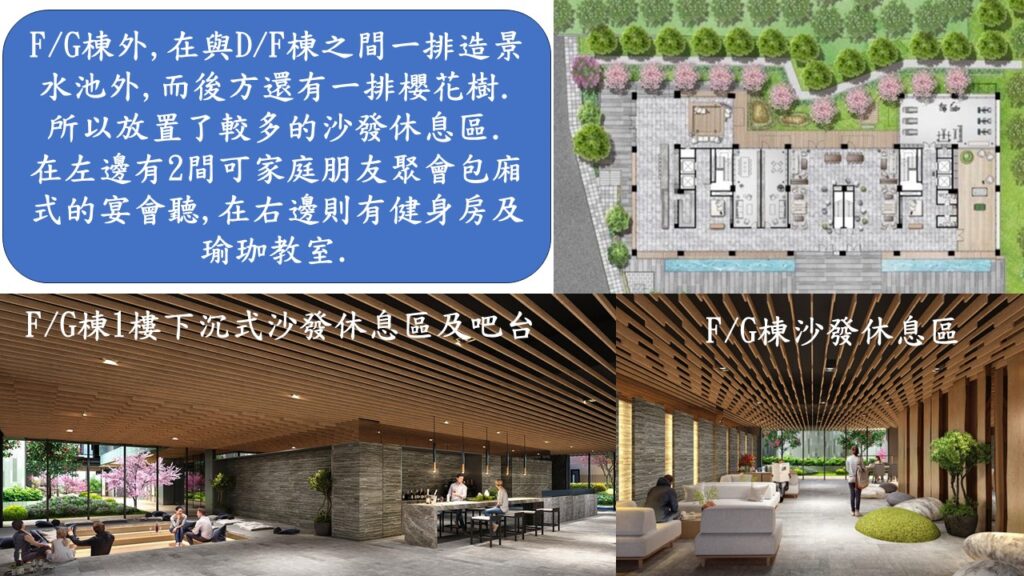 另外,各棟也都有自己的公設,這裡只有F/G棟說明.由平面圖來看,知道有較多的沙發休息區,也有包廂式的宴會廳,以及熱愛運動的人最需要的健身房和瑜珈教室.